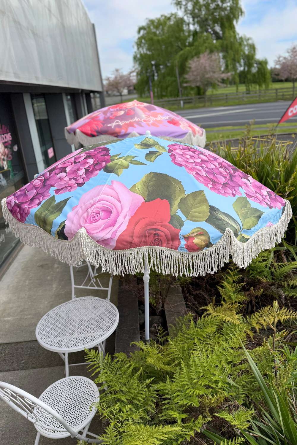 Introducing the Annah Stretton Love In The Mist Umbrella, a gorgeous retro style tasselled beach umbrella in a stunning blue rose and hydrangea print. Your stylish companion for sunny days and beach adventures! These vibrant umbrellas are ready to add a touch of retro flair to your outdoor experiences.