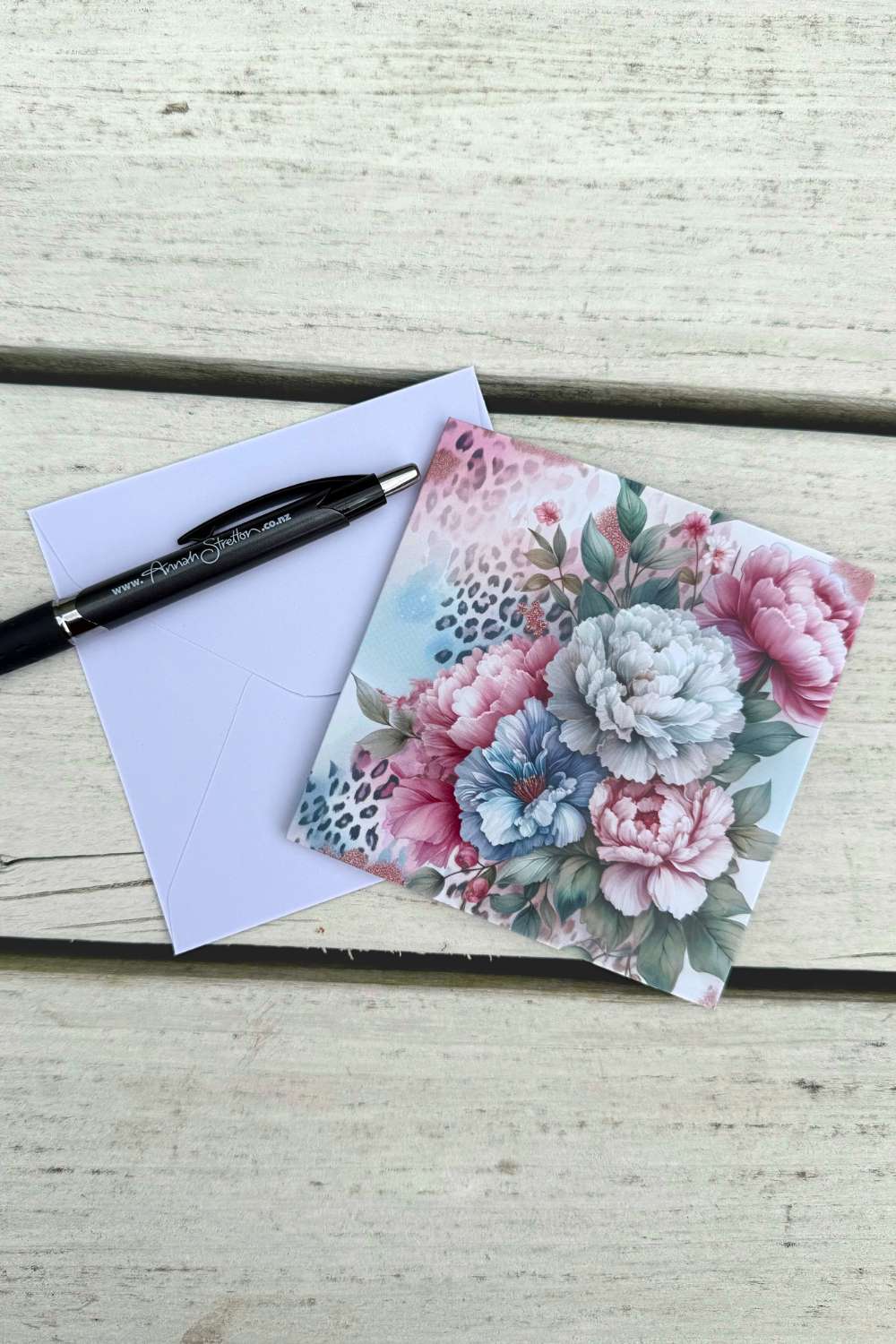 Featuring Annah Stretton’s Feline Grace floral design in soft pink, blue, and cream tones, this card adds a touch of elegance to every gesture. Pair it with a thoughtful gift or let it stand alone as a meaningful message.
