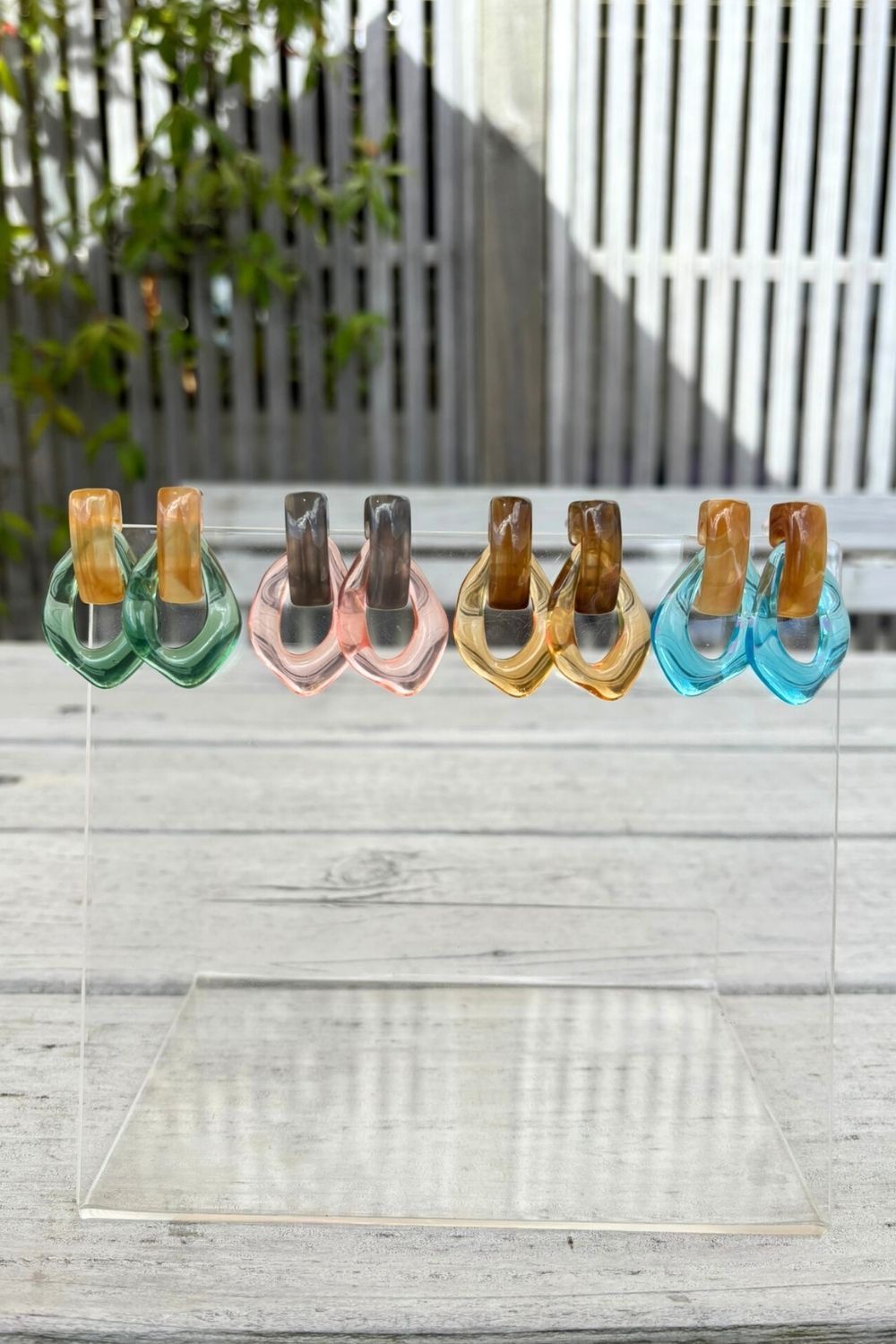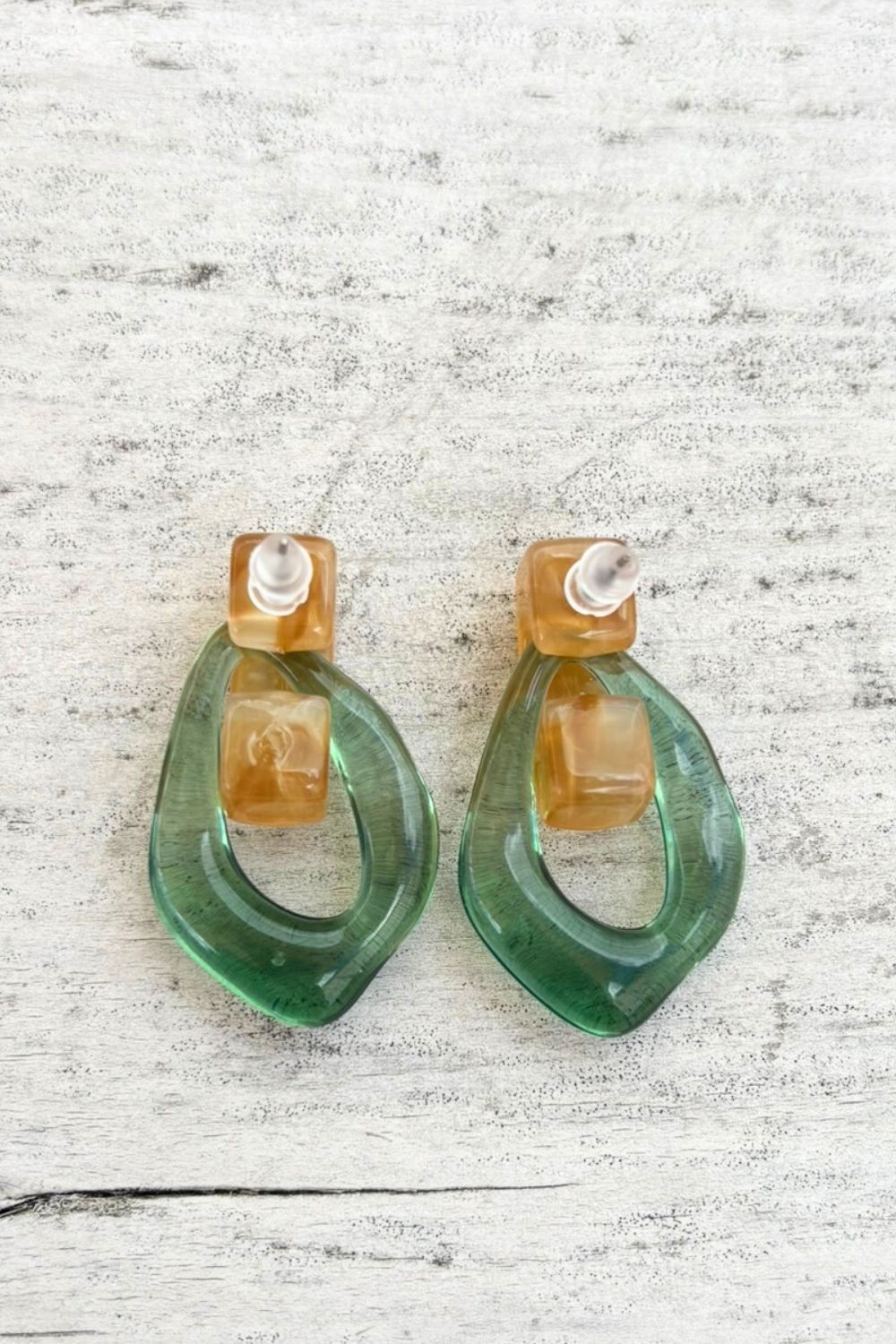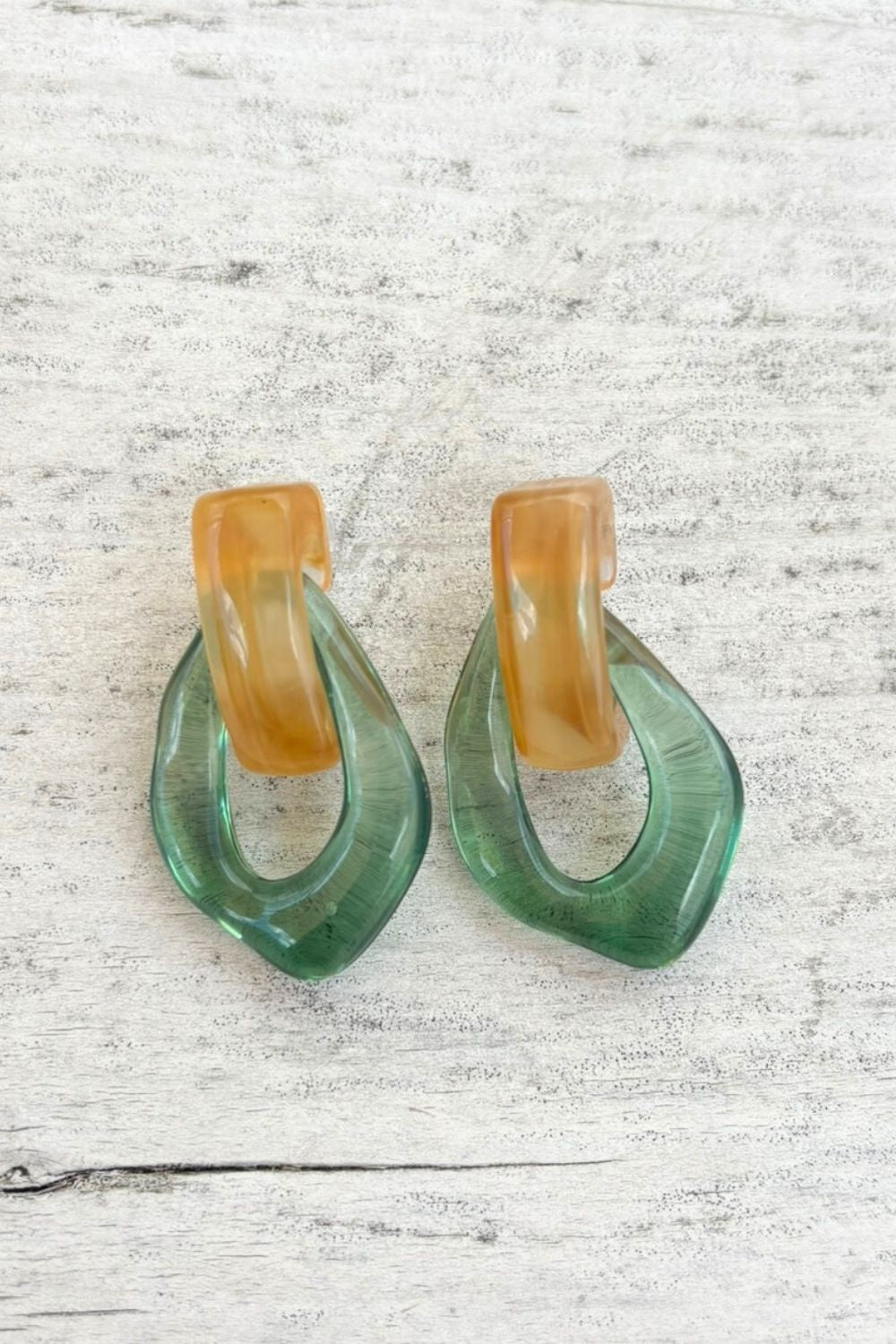 Add a soft pop of colour to your look with the Twiggy Hoops in Green. Featuring a sculptural geometric shape, these lightweight resin earrings combine a calming sage green tone with warm amber accents for a beautifully balanced, nature-inspired finish.