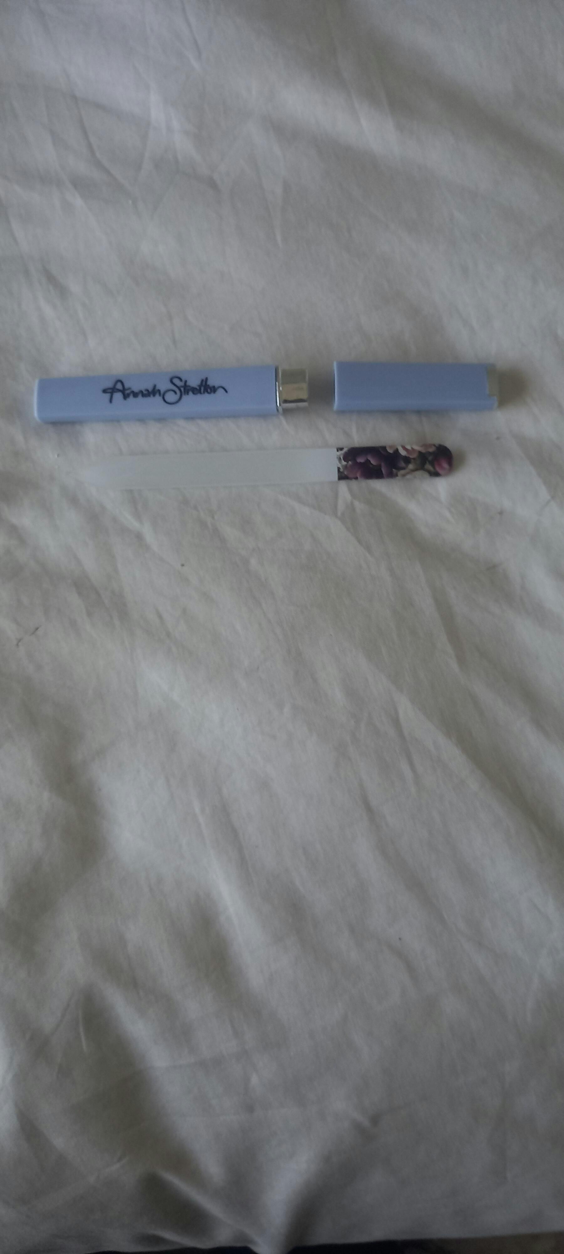 The Annah Stretton Glass Nail File will make the perfect gift or stocking stuffer. Featuring a floral design and sky blue case.