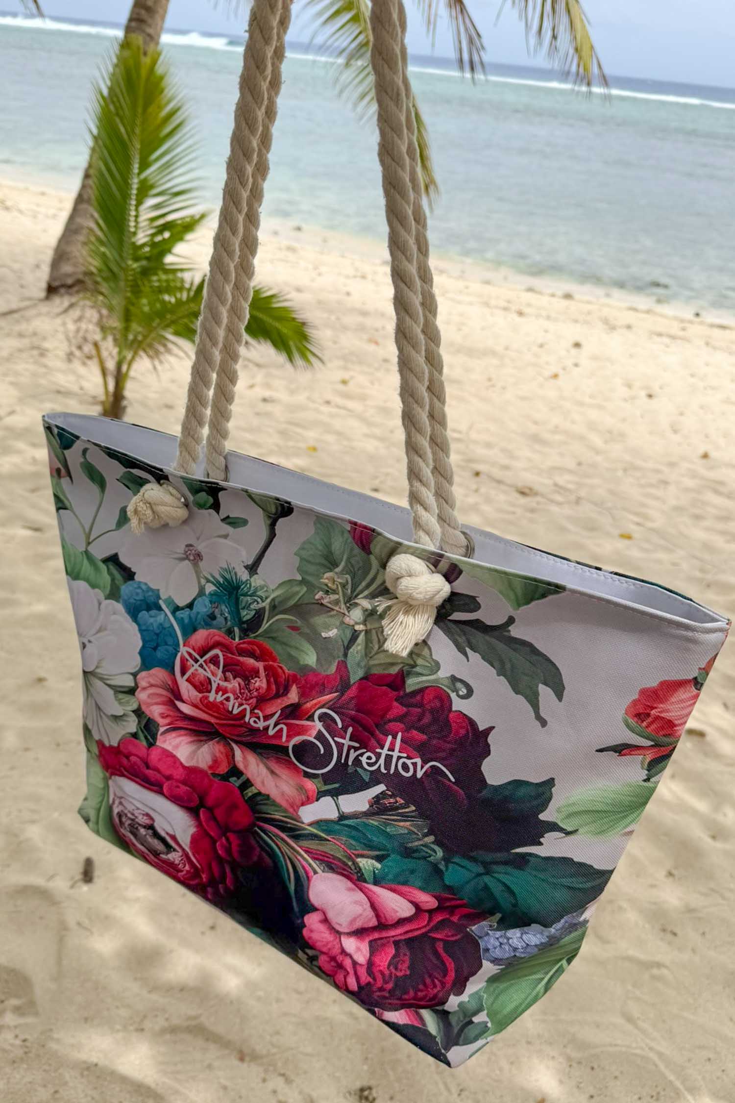 Now in our bestselling J'adore Roses print! The Annah Stretton Large Beach Bag is perfect for trips to the beach. With plenty of room for all the necessities, this fun beach bag is sure to brighten up that day out even more! Made by NZ designer Annah Stretton. Water resistant lining to throw your damp togs in plus an interior pocket and zip closure with a twist rope handle