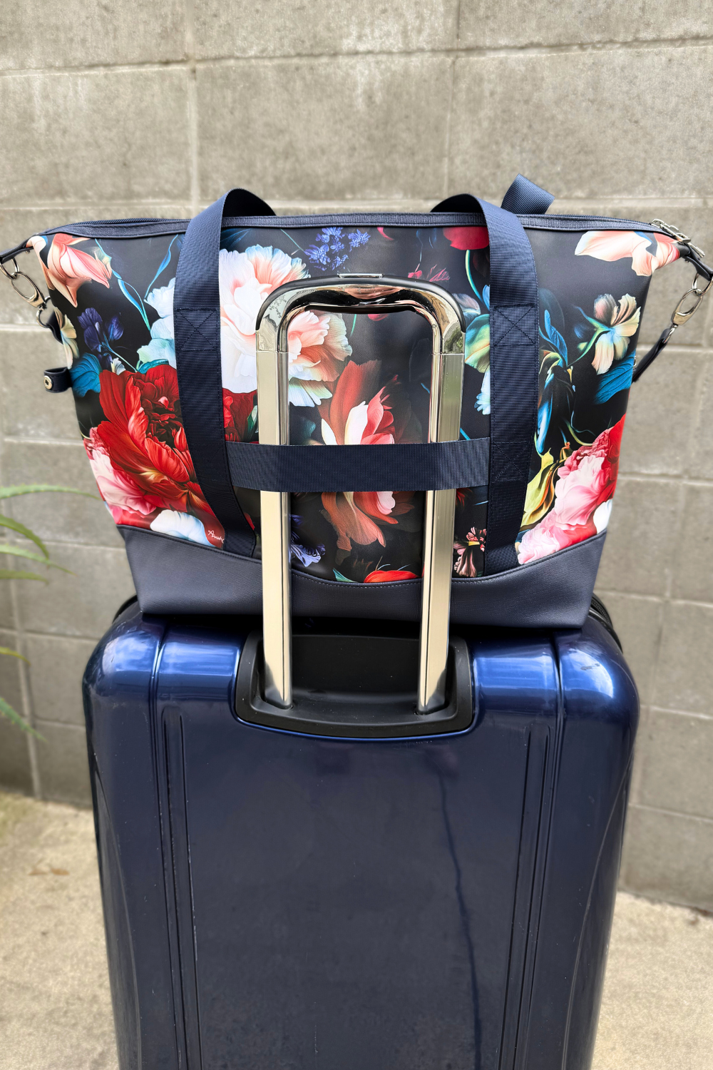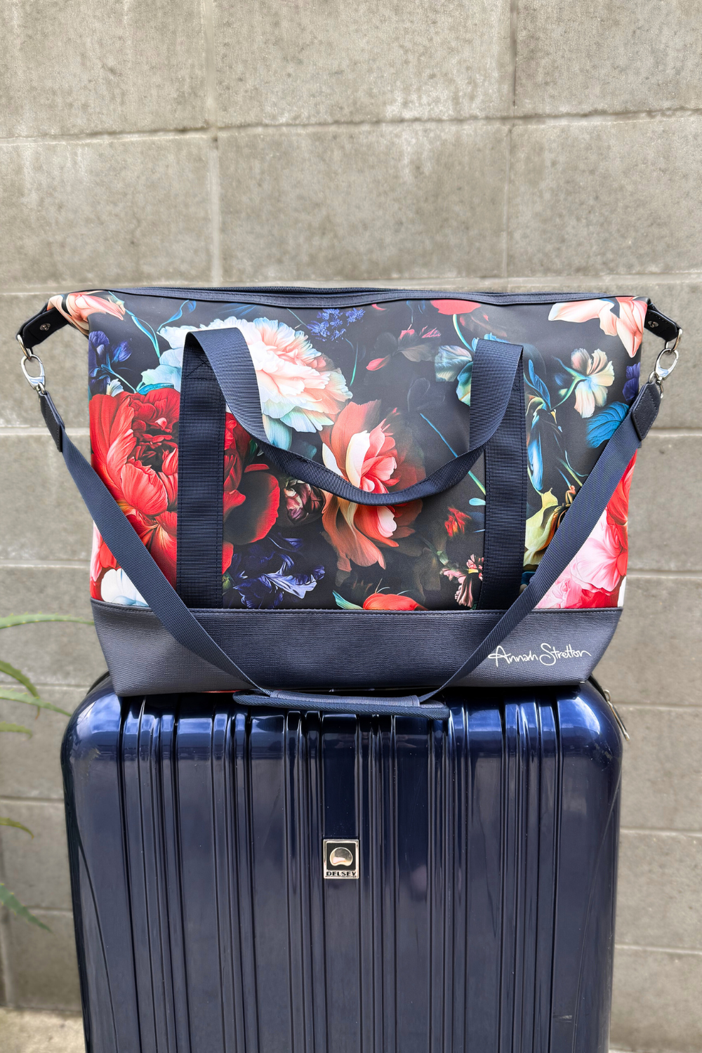 Travel in style with the AS Overnight Travel Bag in the elegant Navy Petal Chorus print by Annah Stretton. Carry‑on approved and designed for both practicality and beauty, this versatile travel companion is perfect for short trips, weekends away, or business travel. Featuring a detachable padded shoulder strap, internal zip pocket, wipeable water resistant lining and a suitcase strap to keep it securely on your suitcase during transit.