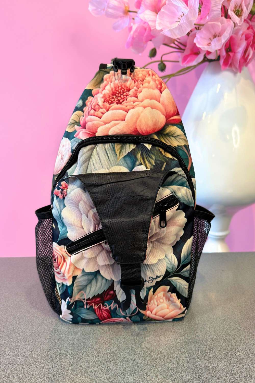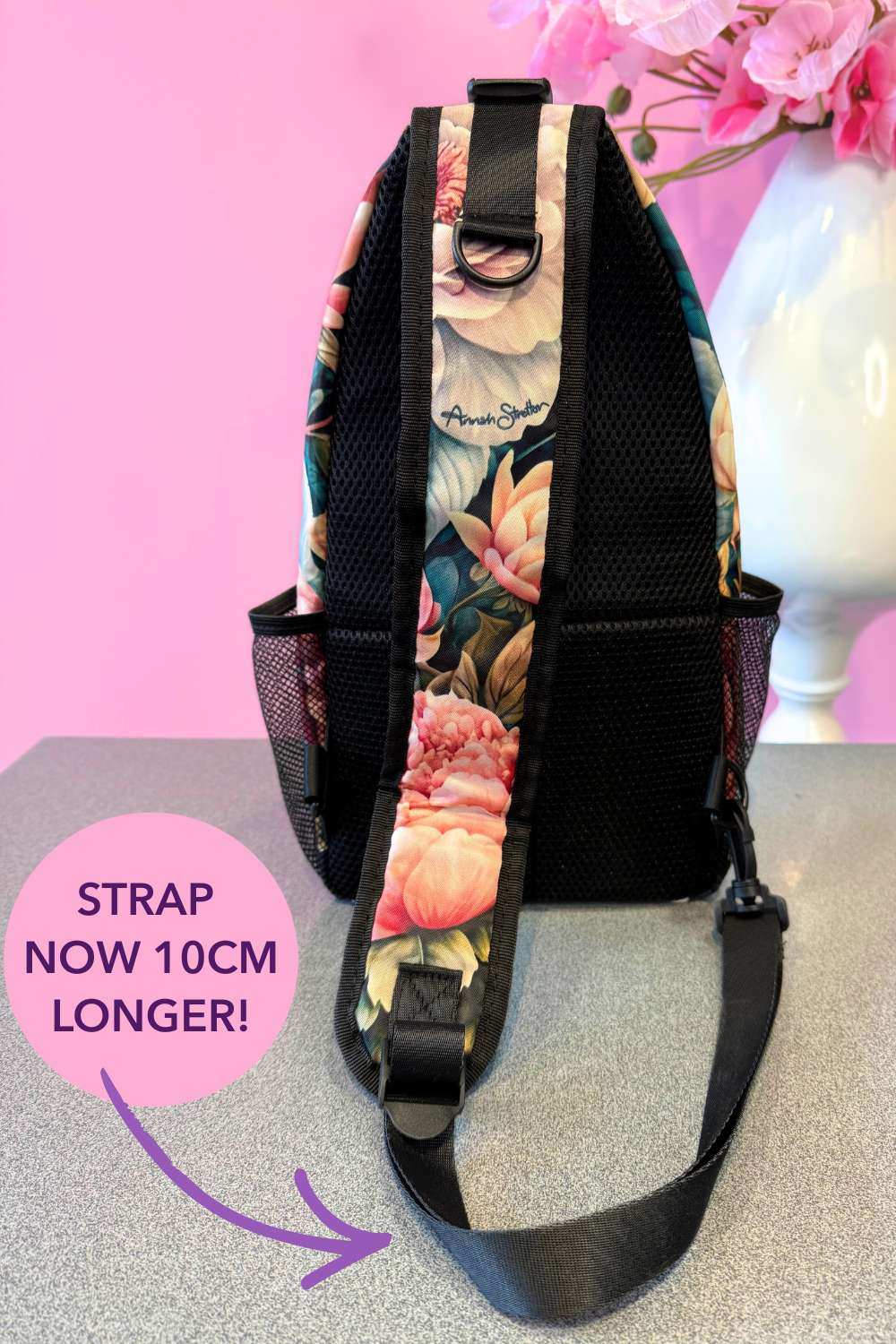 Featuring our signature Spring Serenade print, this lightweight sling bag keeps your essentials close and secure while adding a touch of floral elegance to every outing. With two external mesh side pockets, two zip-up compartments, and one internal pocket, there’s room for everything you need, including two full-sized Annah Stretton drink bottles with space to spare!