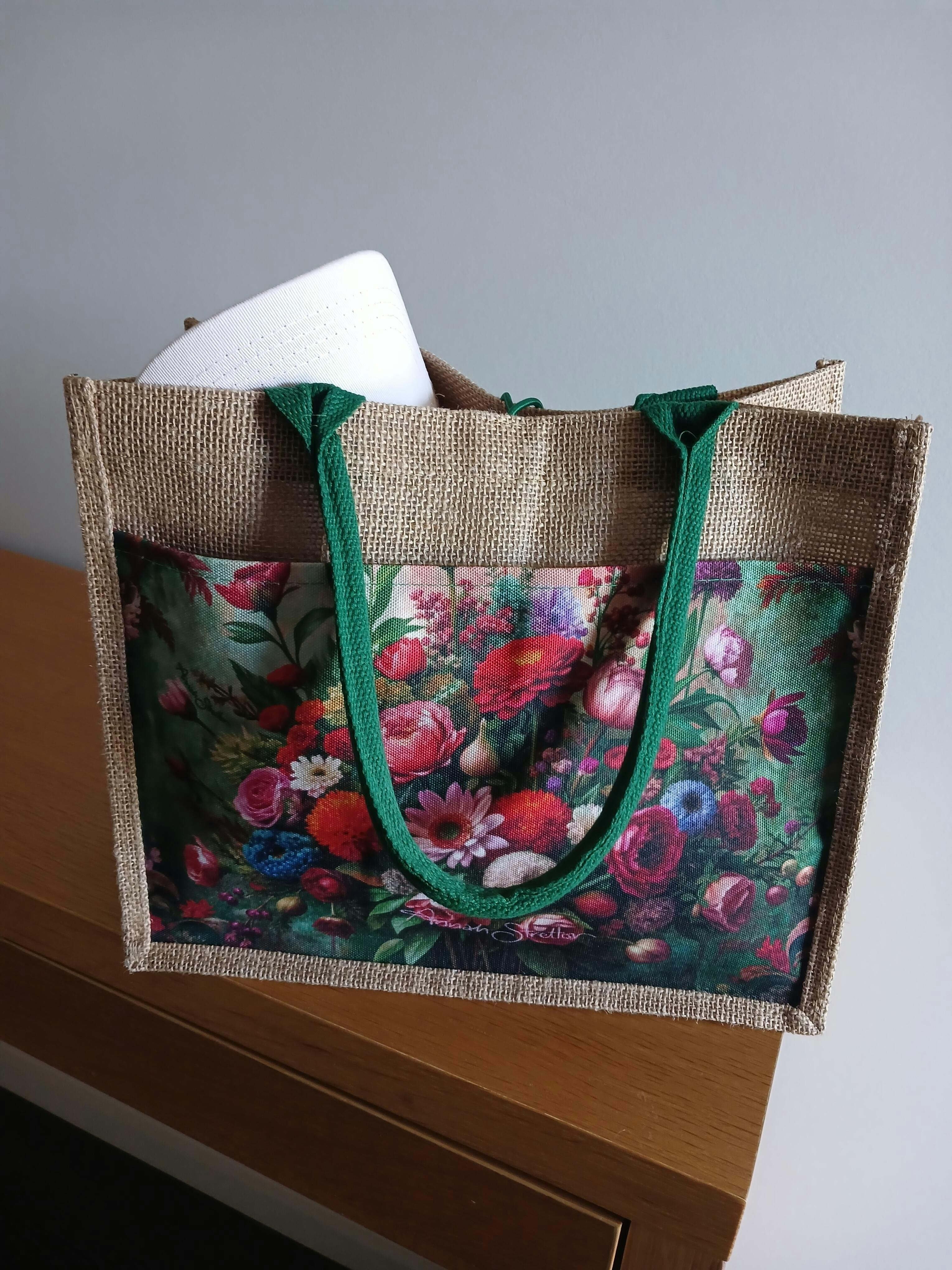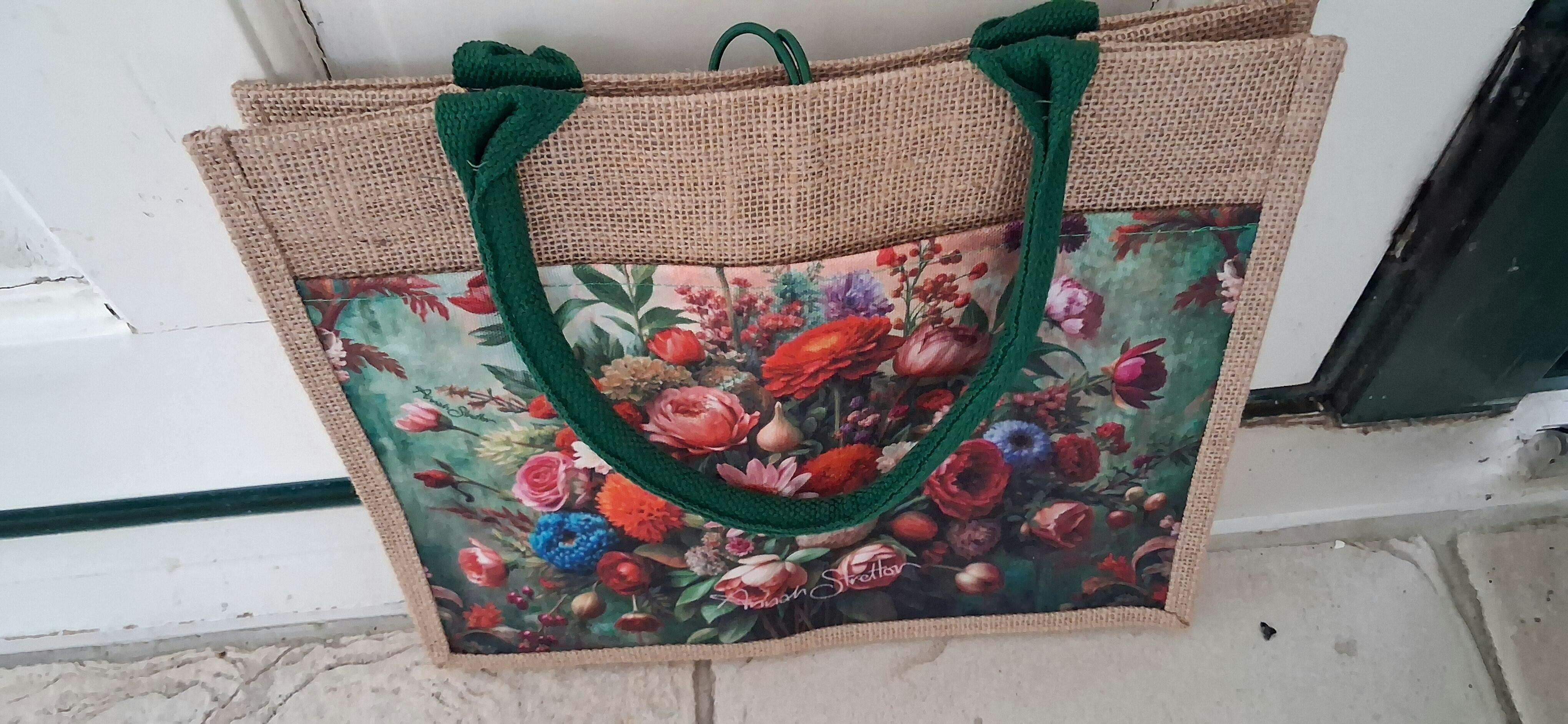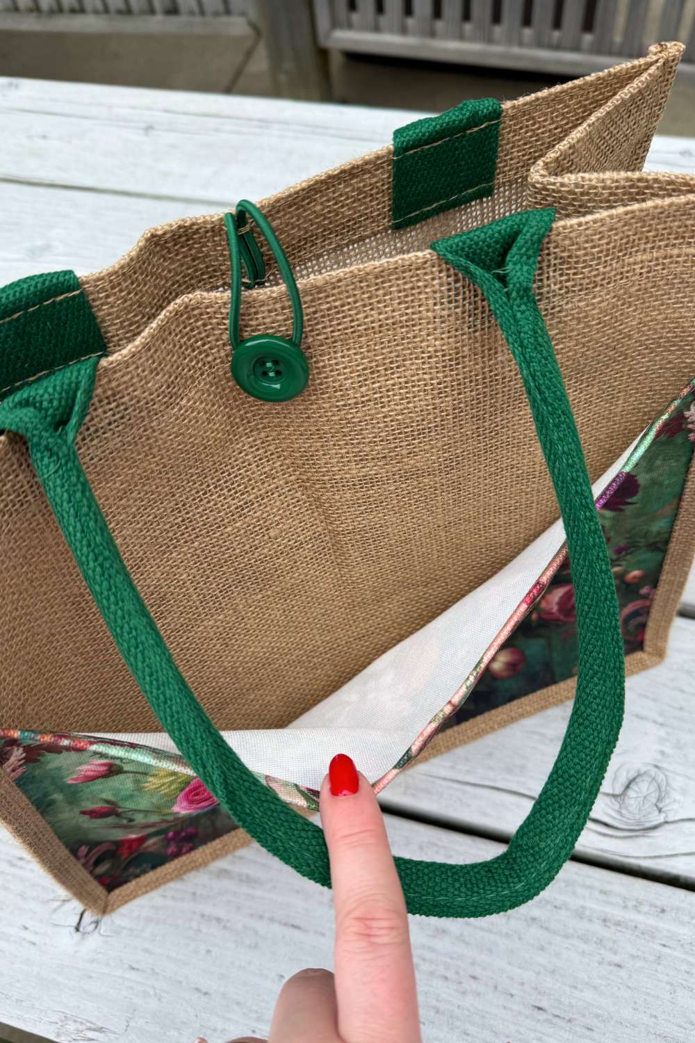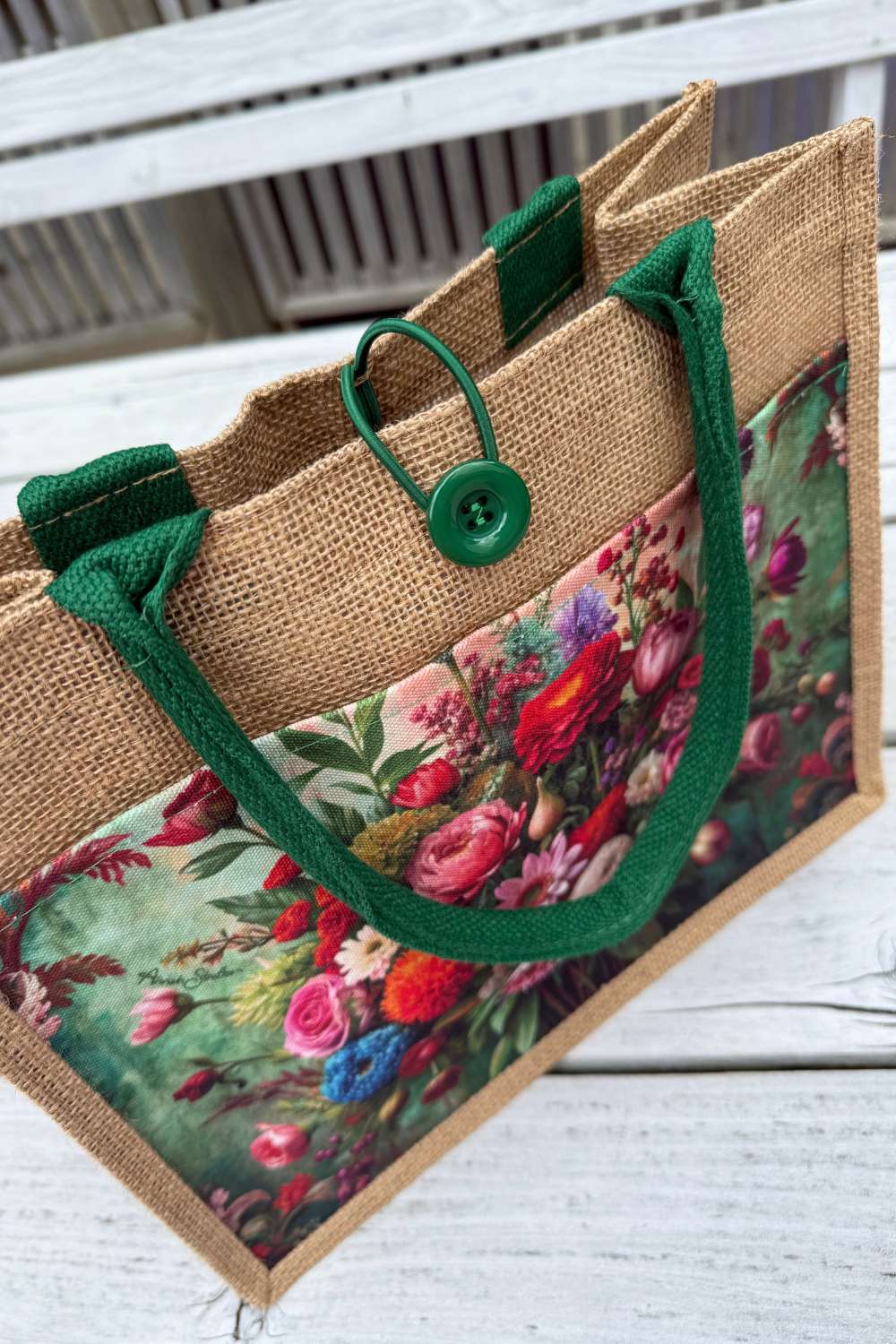 Brighten your next supermarket trip with the Eclectic Bouquet Mini Jute Bag! By NZ designer Annah Stretton, this sturdy bag has stunning green floral pocket design and a button loop close to ensure security. Good sized internal bag size with sturdy jute handles. Fantastic for those who love our jute bags, now in a mini size, handy for those smaller shopping trips, lunch or just carrying a few essentials.