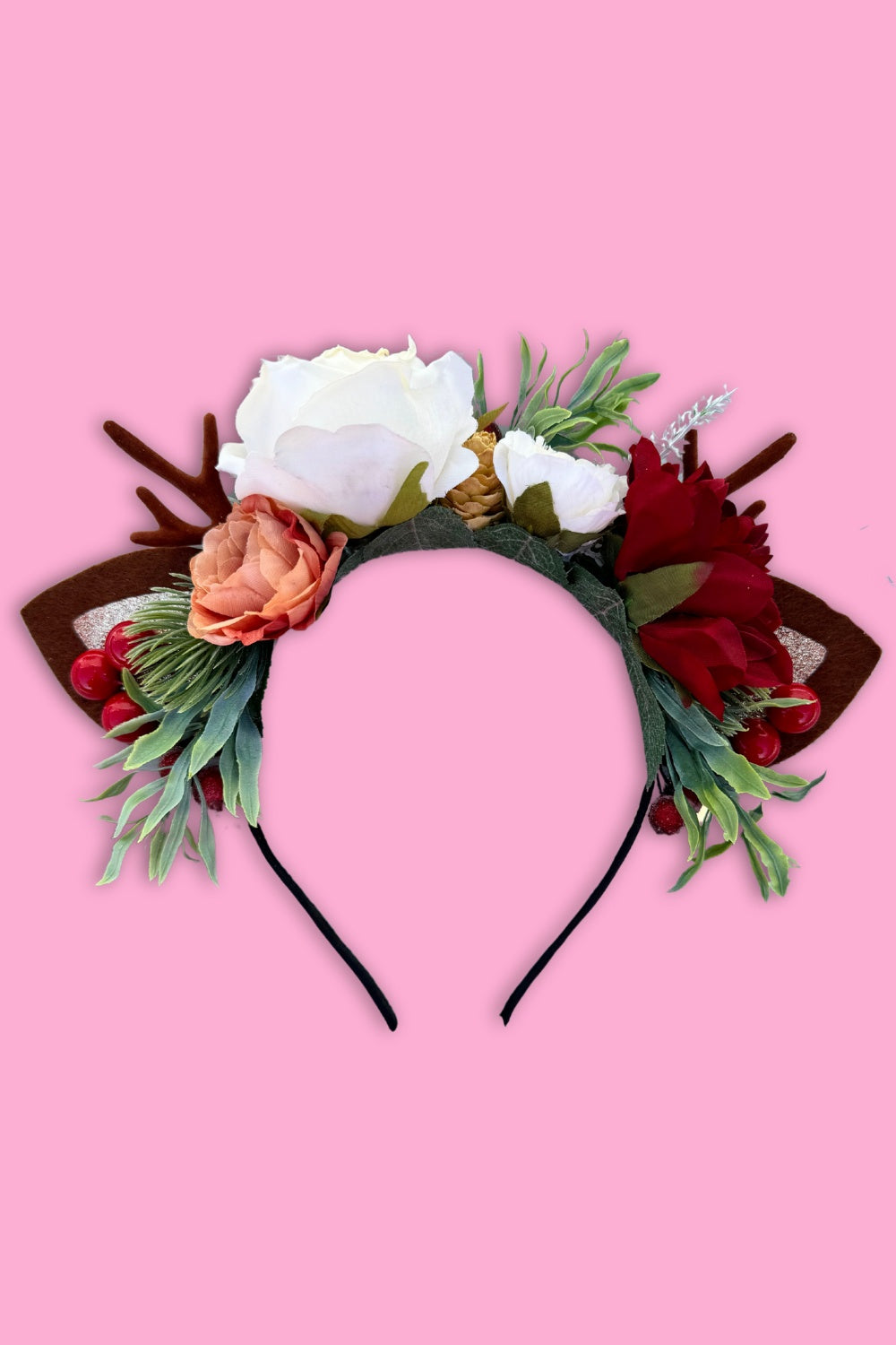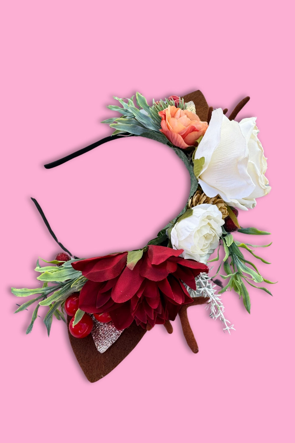 Celebrate Christmas with an Annah Stretton Christmas Festive Headband, our Festive Fern Headband features a floral crown of white, peach and sage with red berries, little reindeer ears and felt covered antlers, the perfect accessory for your Xmas party outfits.