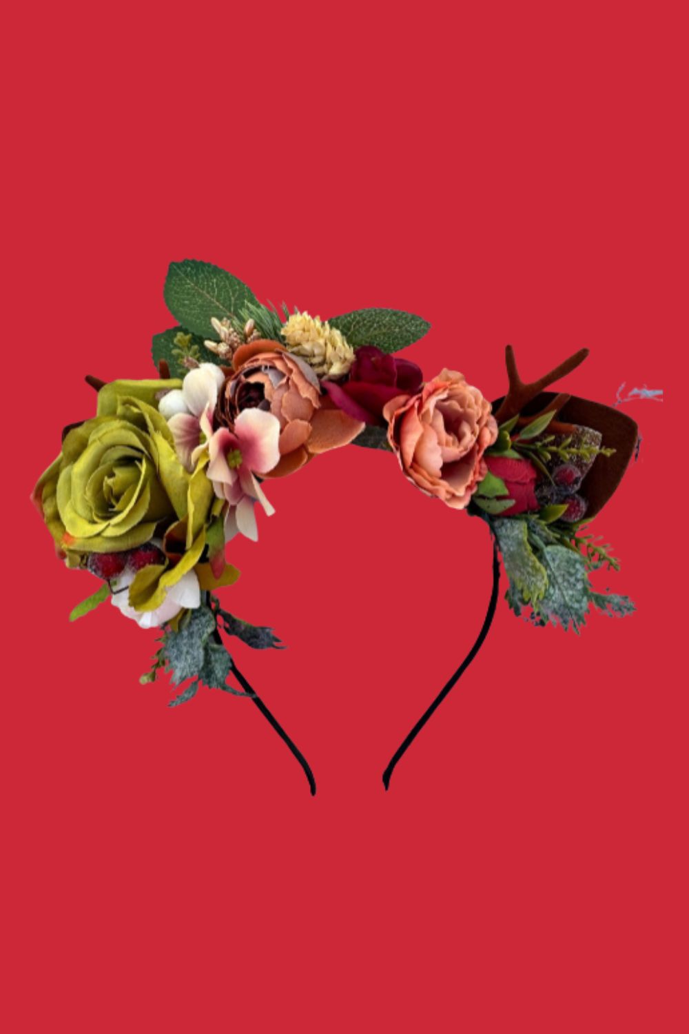 Celebrate Christmas with an Annah Stretton Christmas Festive Headband, our Festive Flora features a floral crown of white, peach and sage green with foliage and little reindeer ears and felt covered antlers, the perfect accessory for your Xmas party outfits.