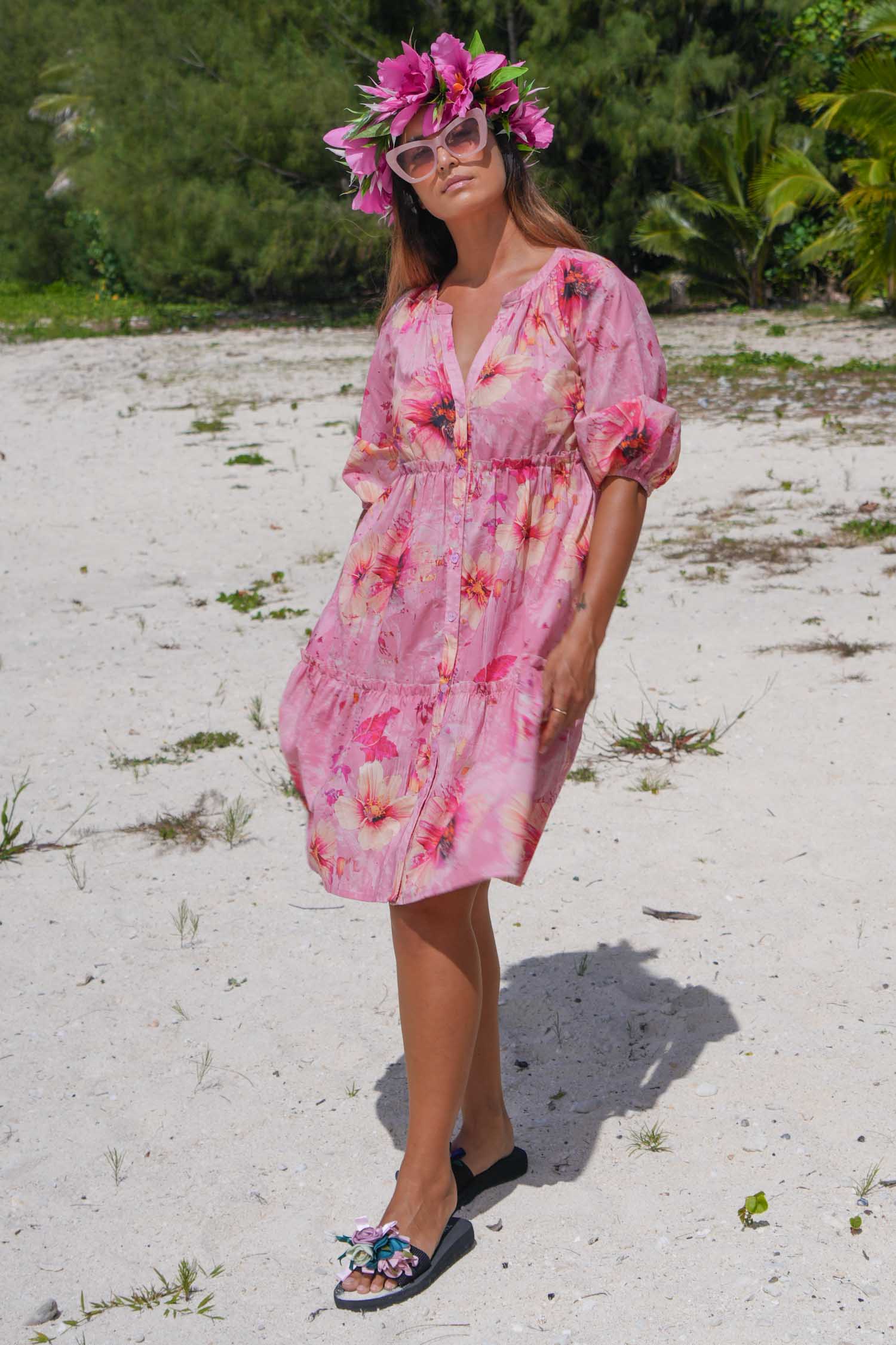 This vibrant floral dress features a flattering V-neckline, ¾ length sleeves, and a tiered silhouette that moves with ease. Finished in the striking Fractured Florals print, it’s lightweight, comfortable, and versatile perfect for beach days, casual outings, or everyday style.