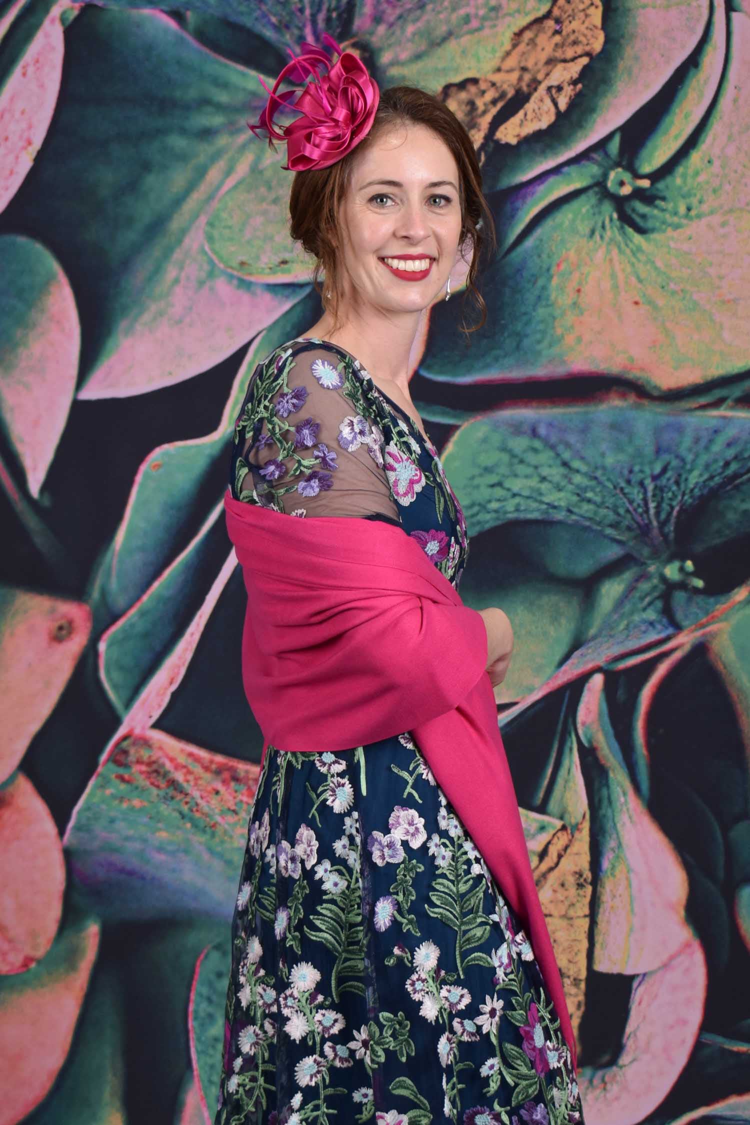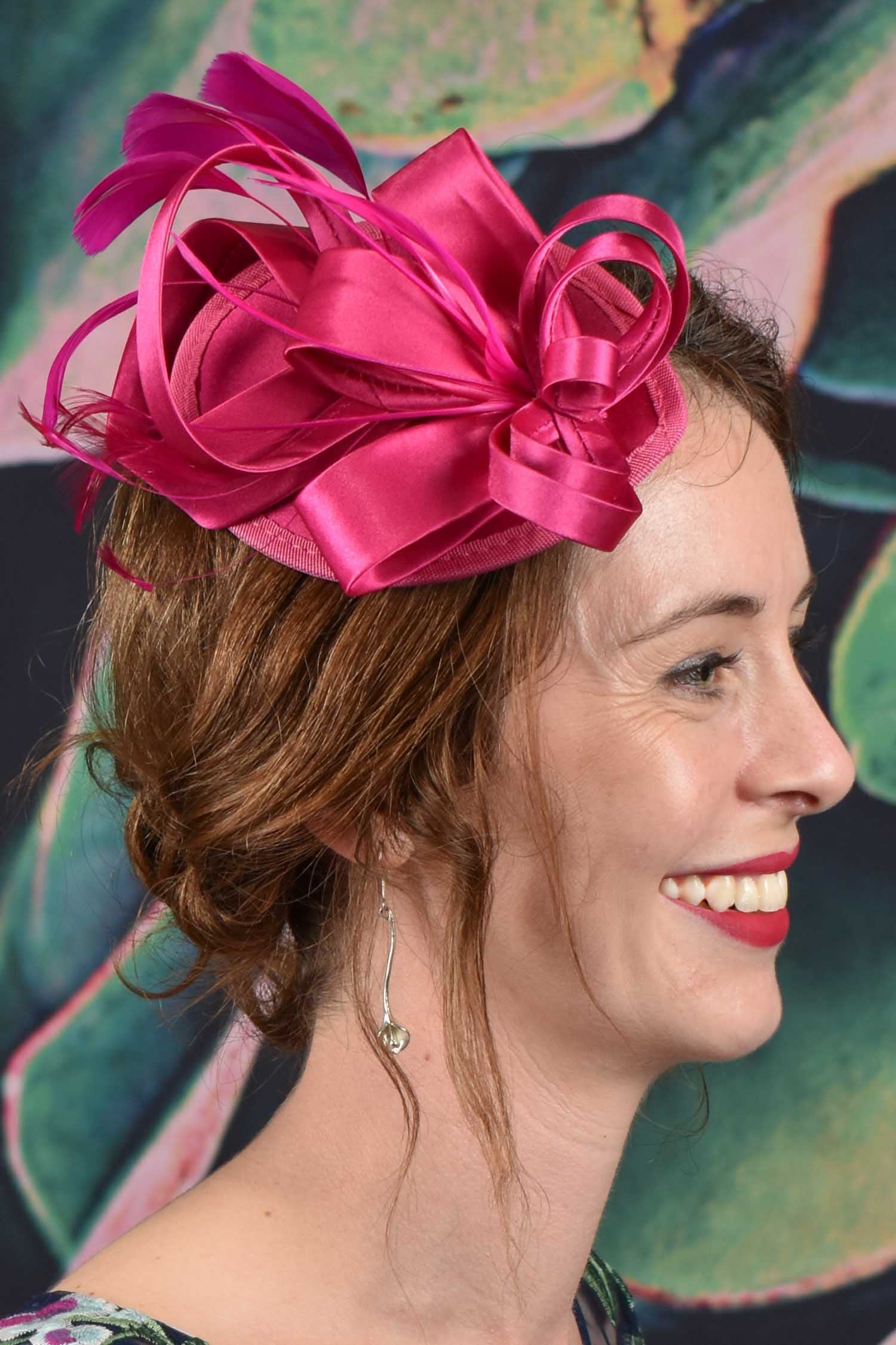 The Ribbons in the Sky Fascinator is timeless and elegant. Featuring a clip fastener adorned with varied sizes of looped satin ribbon and delicate feathers creating a versatile piece for all occasions. The Ribbons in the Sky fascinator also comes with a matching fuschia headband to attach the fascinator to, or wear separately!