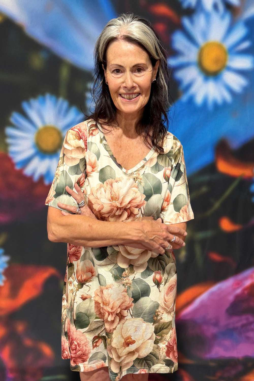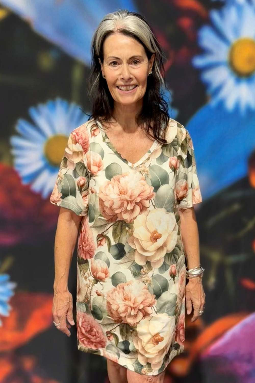 Modelled off our popular Rica Tees, this sleep dress features comfortable elbow-length sleeves, a V-neckline, and a high-low hemline for relaxed ease. Falling to the knee or just above (model is 175cm), it provides modest coverage while staying cool and comfortable. Finished in the Garden Charm floral print, it’s a fresh take on bedtime essentials.