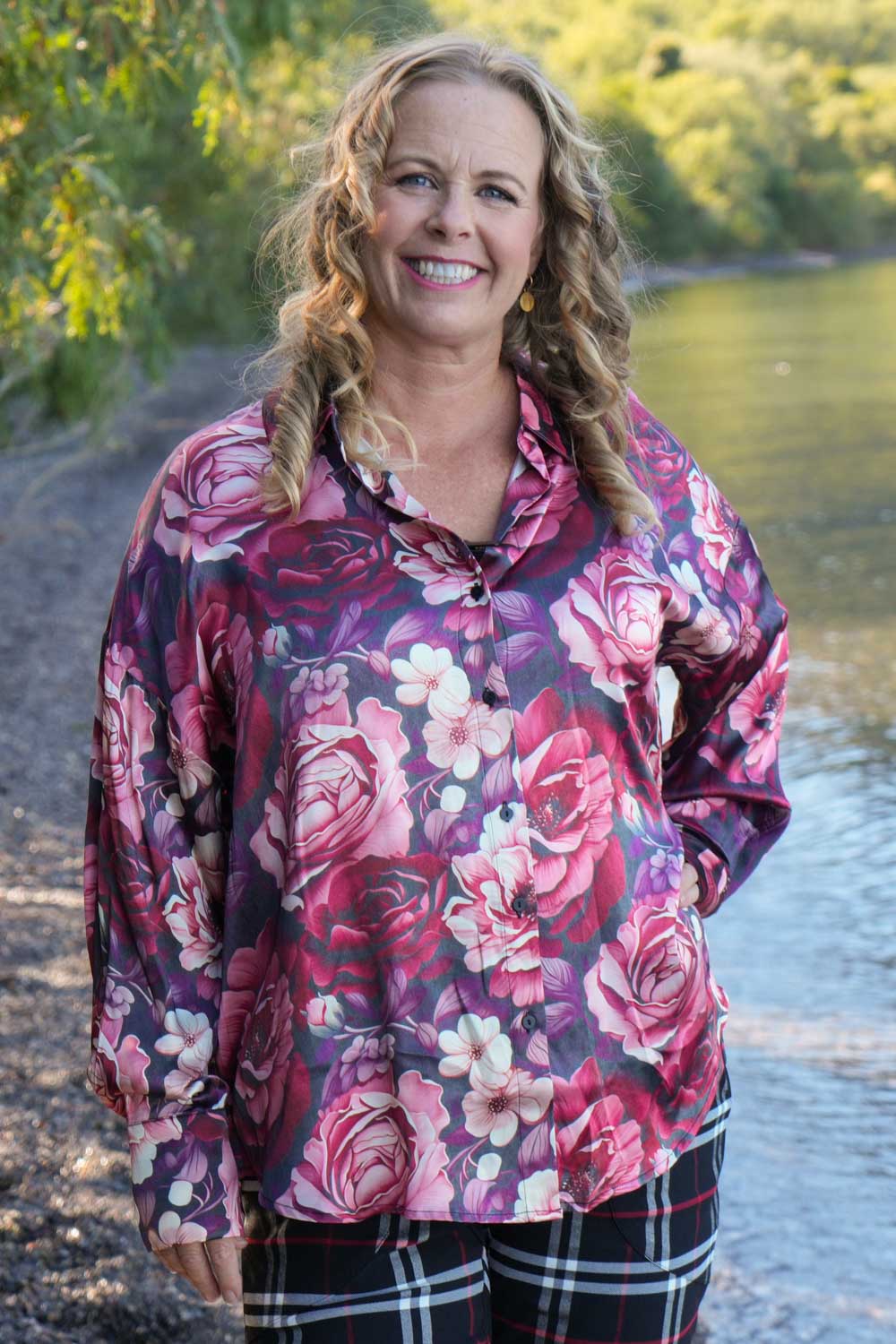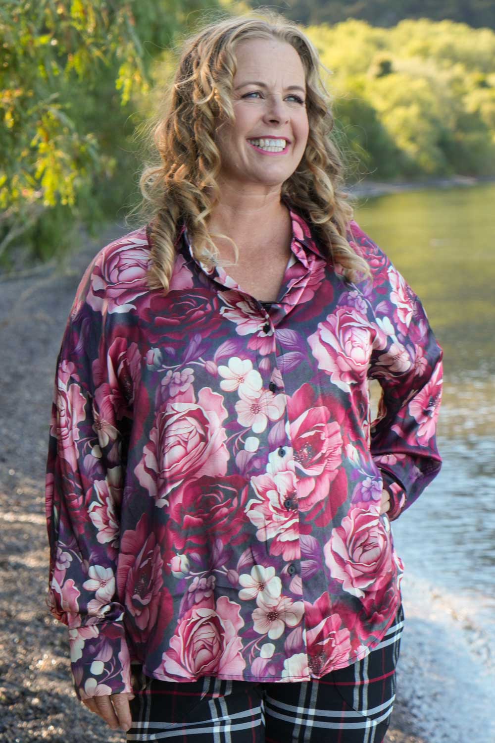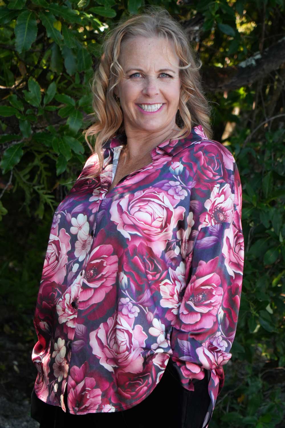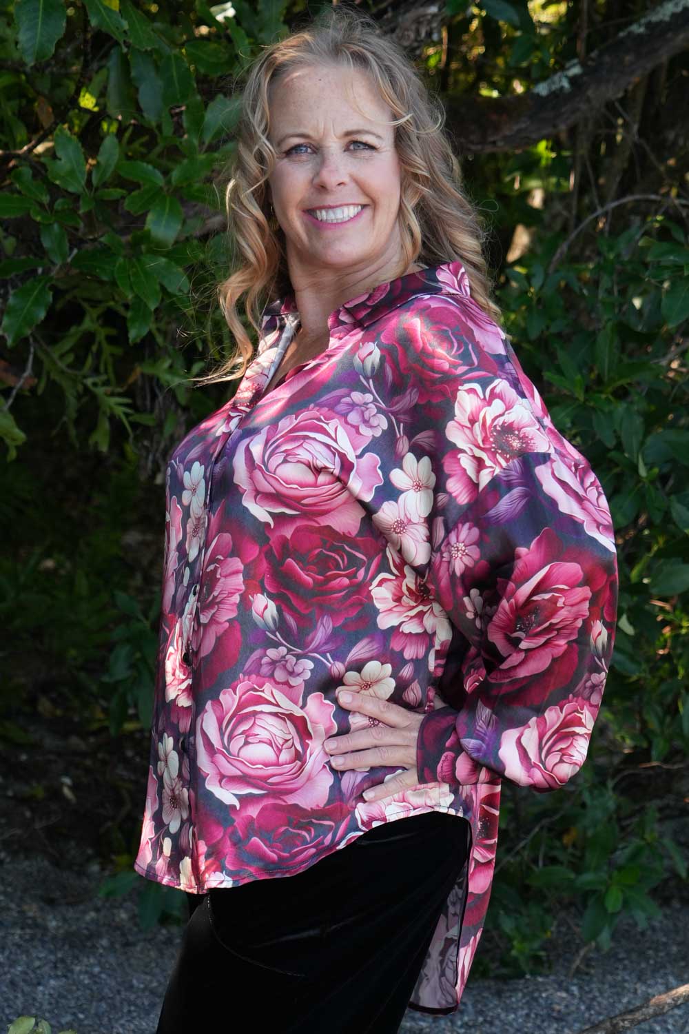 Introducing our beautiful Take Me Home Shirt in our gorgeous Berry Blossom print! This eye catching Shirt features a button up collared V-neckline and button up cuffed Bishop sleeves allowing for adjustable styling.