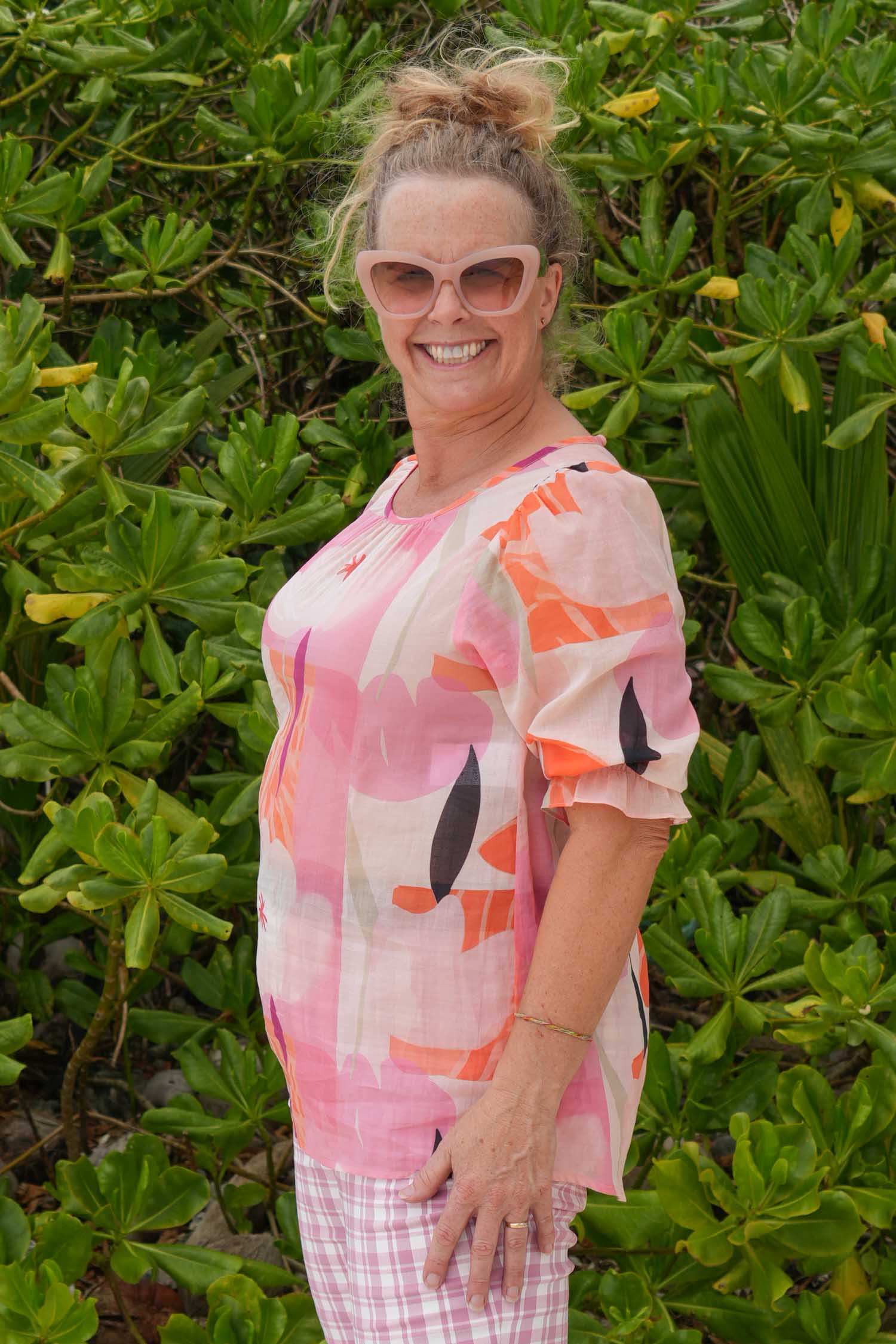The Victoria Top – Modern Botanica by Annah Stretton is your new go-to summer blouse. Designed in a vibrant pink and orange floral print, this top features soft puff sleeves and a relaxed silhouette for effortless warm-weather style.